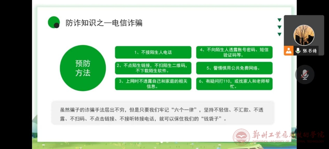 为增强我校信息工程学院学生的防骗意识,提高识别骗局的能力,持续构筑学生防电信诈骗的思想防线,使同学们安全安稳的度过大学生活,以大学生暑期在家为契机,8月11日,信息工程学院线上开展了一场走心、入脑、记忆深刻的防诈骗线上宣讲活动。
