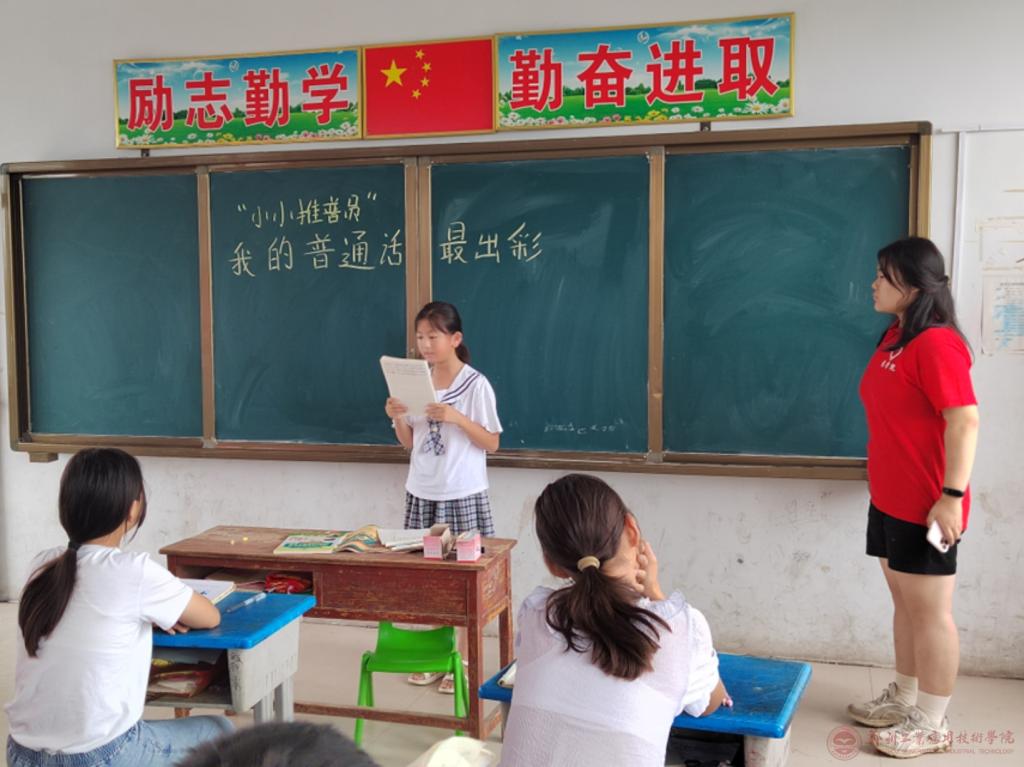 “青年是祖国的未来,民族的希望”,推普队员们在商丘市夏邑县韩道口镇开展普通话推广社会实践活动,推普队员们于7月25日当天将推广普通话紧密渗透于支教之中。在课堂上支教队员们邀请孩子们参加词语朗读小活动,通过纠正孩子们的发音和拼读错误,讲述普通话对学习的重要性,增强他们对普通话的接受度。同时开展诗朗诵,绕口令等趣味互动游戏,多元化教育引导孩子们了解普通话,学习普通话,爱上普通话。