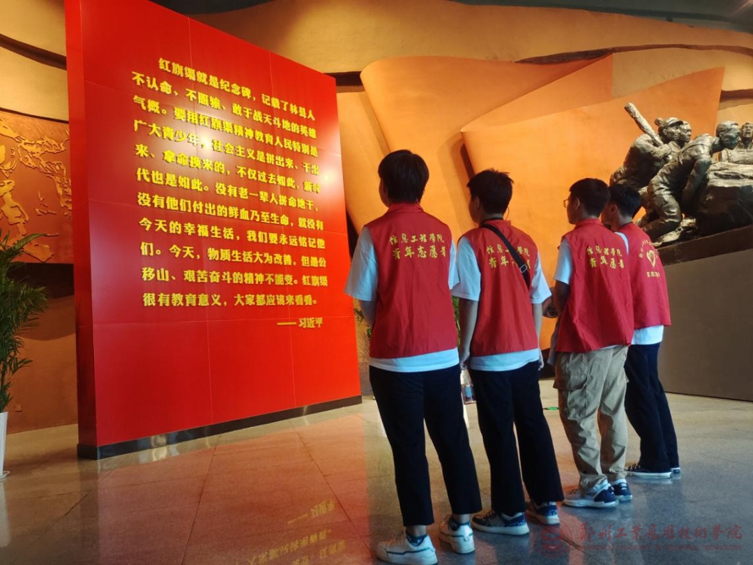 为深入学习宣传贯彻习近平新时代中国特色社会主义思想,全面贯彻落实党的二十大精神,落实团十九大各项任务部署,引导和帮助广大青年学生在与现实相结合的“大思政课”中“受教育、长才干、作贡献”,7月19日郑州工业应用技术学院信息工程学院“梦之渠”文化寻访团前往河南省林州市红旗渠开展2023年暑期“三下乡”社会实践活动,学习习近平总书记在视察河南安阳重要讲话精神,在实践中追寻红色足迹,感悟红色精神。