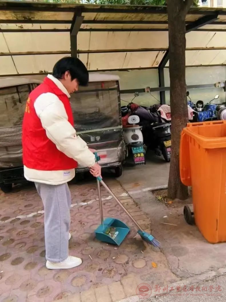 11月12日,信息工程学院青年志愿者在新新家园社区举行“大学生社区实践计划”活动。活动现场,志愿者们手持扫帚、铲子等卫生工具,分组分区域对小区各个主干道、楼道及大门口等公共区域进行了全方位清扫。随后,志愿者们联合小区物业人员将停放无序的电动车一一挪移,整齐停放到规定的停车区域。大家分工明确,各司其职,不放过任何死角,忙碌的“红马甲”穿梭在小区中,共同净化小区环境。除此之外,志愿者们还主动和社区的老人们聊天,询问老人近期的身体健康状况,说着家长里短。志愿者们带着亲切的笑容,热情的态度,老人们也感受到了青年志愿者们的温暖和关怀。