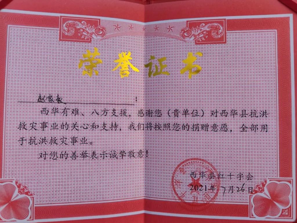 赵家豪的事迹被当地的红十字会知道后,当地红十字会为赵家豪以及他的朋友们颁发了荣誉证书。赵家豪同学表示:在河南经历大灾面前,身为团员青年,应当为自己的家乡贡献自己的一份力量,自己只是做了一些自己力所能及的事,在大灾面前,只要我们团结一心,就一定可以共渡难关!