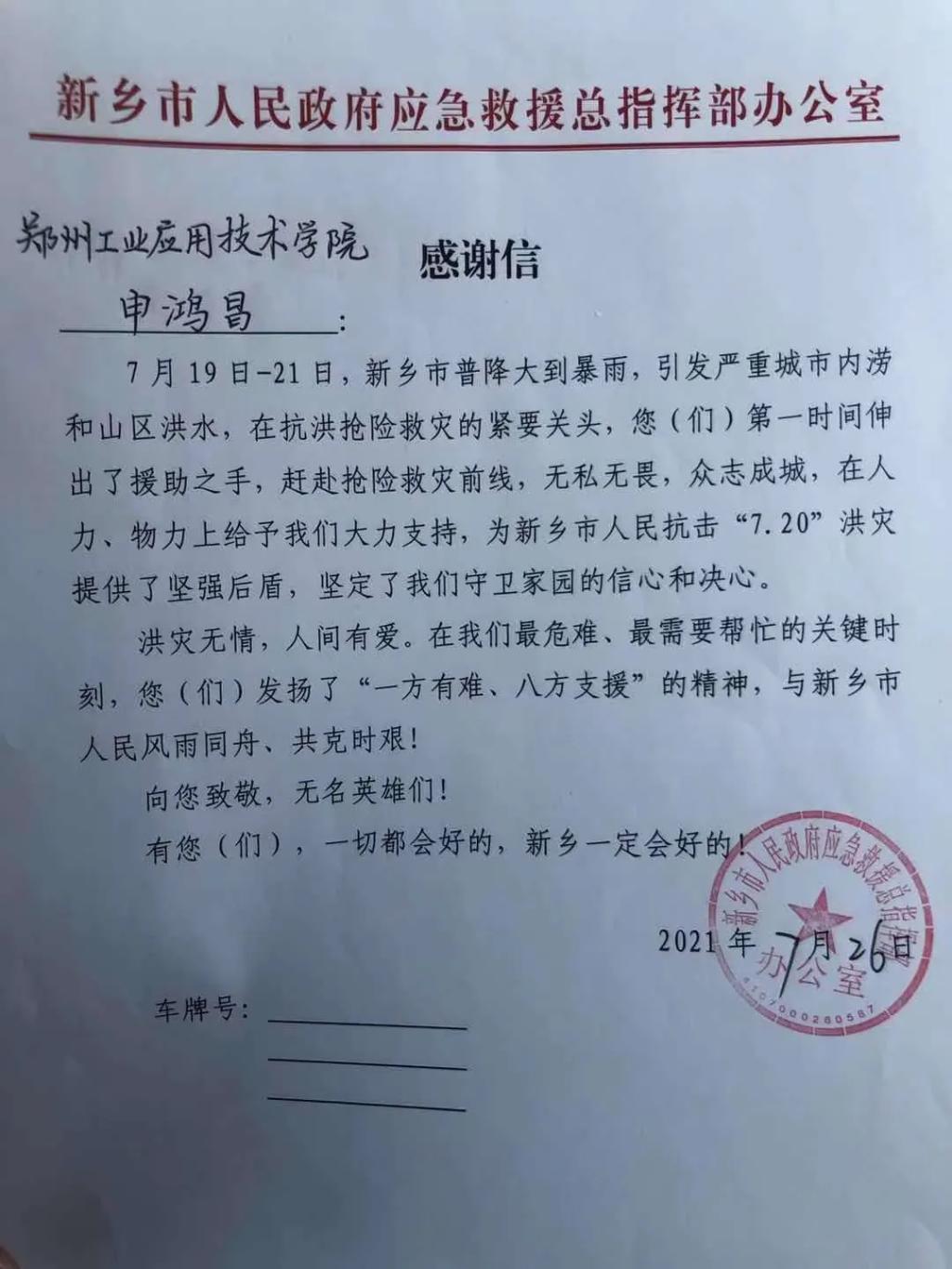 信息工程学院19级大数据与科学四班学生杨永恒来自开封。开封各地此次受灾严重,各地都积极组建队伍进行救援。杨永恒同学积极参加所在乡镇应急管理所,加入到救援队伍中去。他跟随队伍在33个村中进行救灾活动,积极转移群众、抢修路面、清理河道、堵河堤决口。在这些天中,他不怕危险,认真努力,用自己的力量帮助家乡救援,并被镇里树立为志愿者优秀典型表彰。