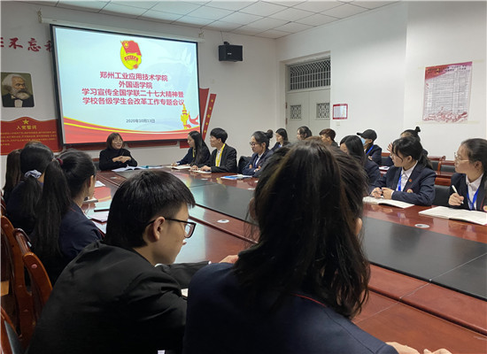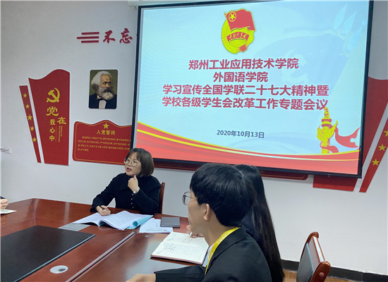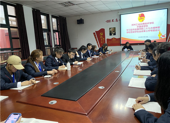 本网讯(通讯员 高于荷)为深入学习宣传中华全国学生联合会第二十七次代表大会会议精神,推动外国语学院学生会深化改革创新。10月13日下午4:30,外国语学院在文华2-413会议室组织学生干部代表学习中华全国学生联合会第二十七次代表大会会议精神的专题培训会议。此次会议由外国语学院分国产精品久久久久无码AV书记王玉洁老师主持召开,学生会部分学生干部参加。