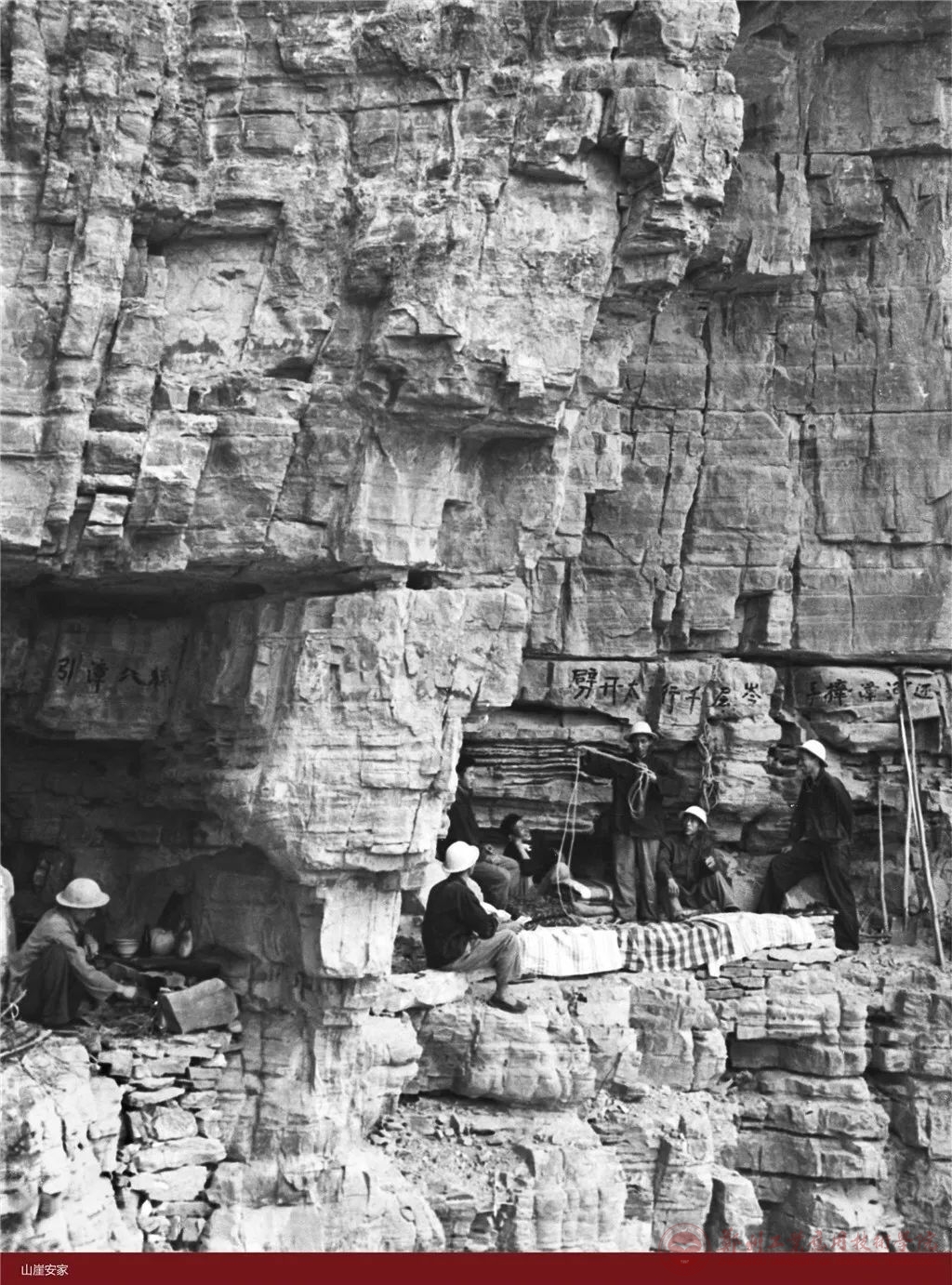 1960年,红旗渠动工之初,正值三年自然灾害共和国最困难的时间节点,据统计,原本第一批分配上去修渠的是2.2万人,实际上上去修渠的民工达到3.7万人,这么多人一下子涌到太行山上,一个现实的问题摆在我们面前——吃和住的问题。吃的问题好解决,林县有3000万斤的储备粮,而且要求上来的民工自带粮食和工具,住的问题怎么办?沿渠线的山西老百姓发扬着友爱的精神,给我们提供了230多间住房,但是面对数万名民工,这些显然是不够用的,剩下的民工们住山崖、宿石缝,有的垒石庵、挖窑洞、搭席棚。几块篷布撑起来就是指挥千军万马的指挥部,三个石头支起一口大锅就是人们的大伙房。照片上这个地方叫做虎口崖,白天民工们在这个地方挥锤打钎,晚上绳子一拦,铺盖卷一铺,头朝里脚朝外夜宿山崖。红旗渠是在1960年2月开始动工的,正月都还没有出,天气非常寒冷,山里的温度达到零下一二十度,滴水成冰,夏天的时候蚊虫肆虐,叮咬得厉害,民工们有的晚上正睡觉呢,从被窝里就揪出一条蛇来。当时的条件非常艰苦,但是民工们却一直保持着一种积极乐观的态度,还留下了豪迈的诗篇:崖当房、石当床,虎口崖下度时光,我为后人创大业,不建成大渠不还乡。