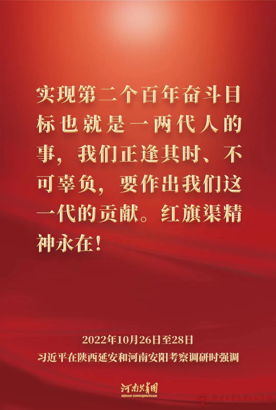 在红旗渠上,习近平总书记强调,“实现第二个百年奋斗目标也就是一两代人的事,我们正逢其时、不可辜负,要作出我们这一代的贡献,红旗渠精神永在!”在全党全国各族人民迈上全面建设社会主义现代化国家新征程、向第二个百年奋斗目标进军的关键时刻,广大青年要积极继承和弘扬红旗渠精神,从红旗渠精神里汲取奋斗的智慧和力量,在全面建设社会主义现代化国家的伟大实践中绽放自己的青春之花。