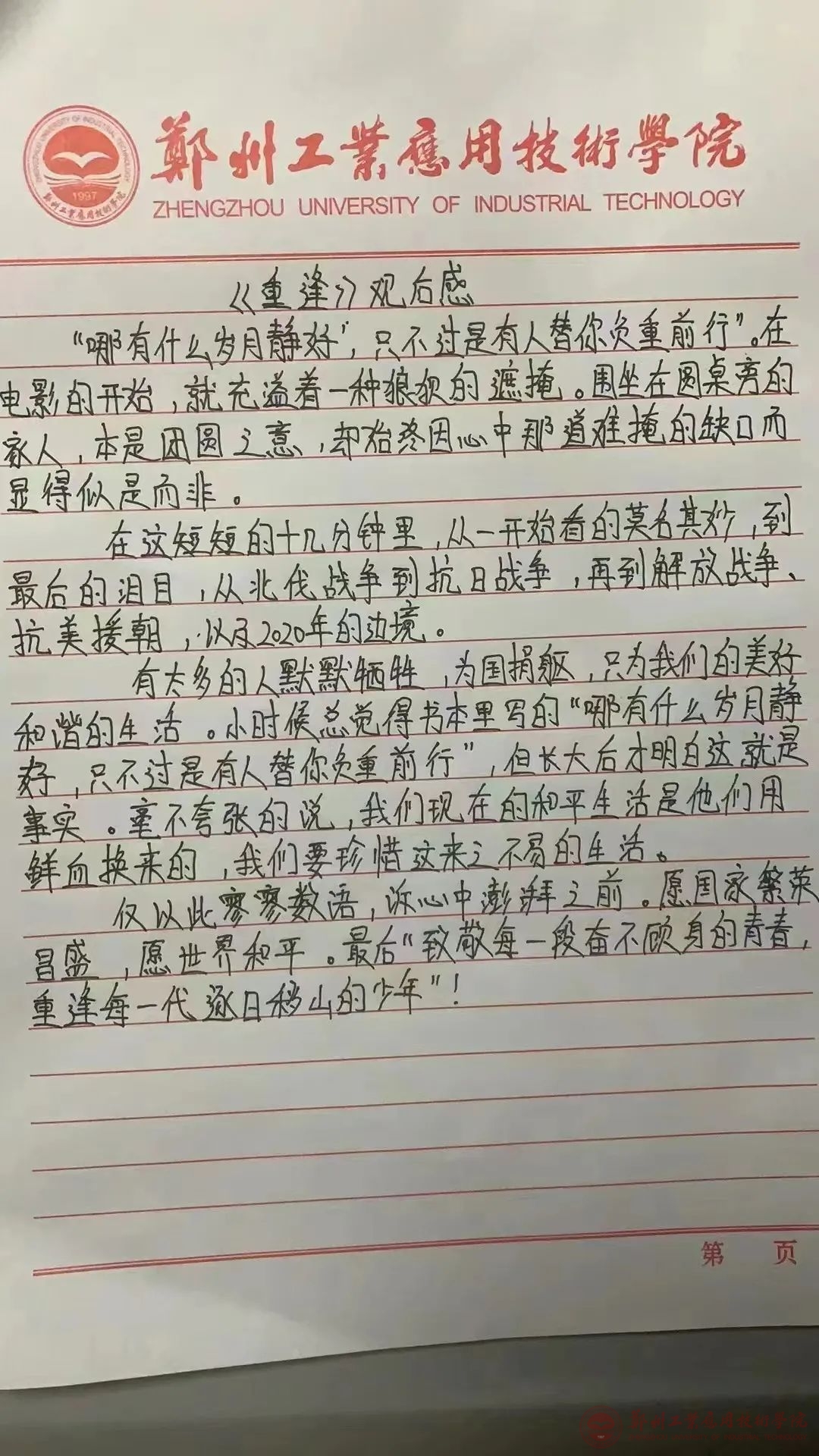我们生在红旗下,长在春风里,人民有信仰,国家有力量,民族有希望。通过电影我感受到当代青年“清澈的爱,只为中国”,共同体会革命烈士英勇奉献,不惧牺牲的高尚品质。所有的岁月静好,是有人在替我们负重前行。欣逢盛世当不负盛世,愿以吾辈之青春,捍卫盛世之中华!