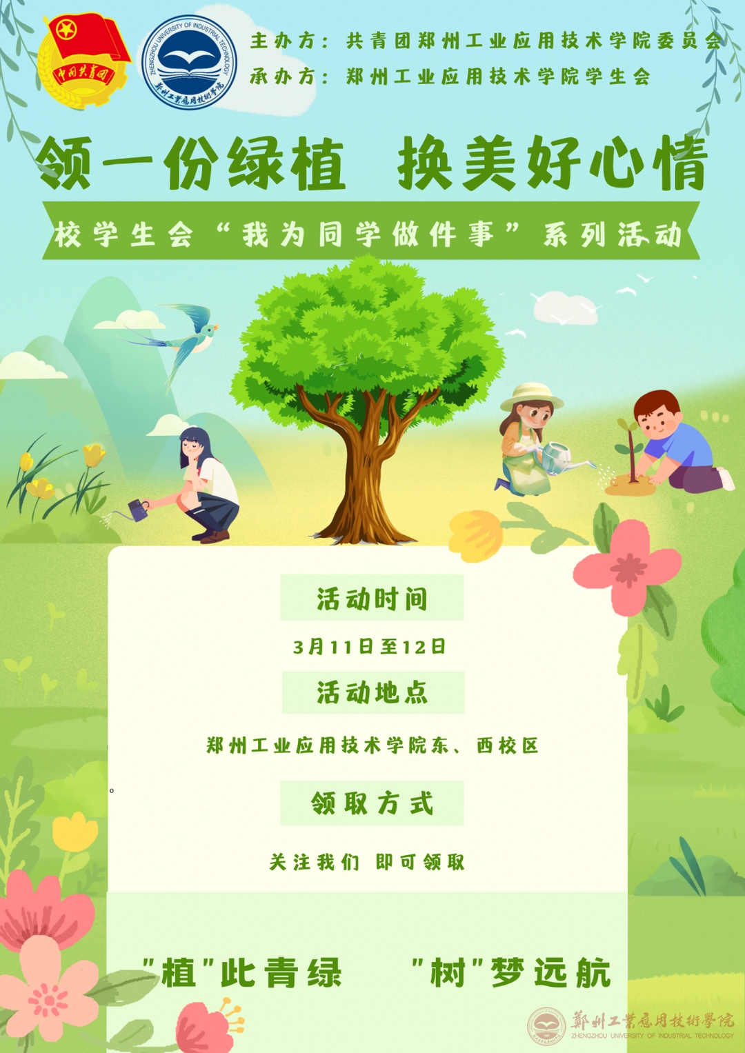 春回大地,绿意萌动。在一年一度的植树节到来之际,为筑牢同学们爱护植物、保护环境的理念,引导大家贴近自然、热爱自然,郑州工业应用技术学院学生会于3月11日——12日在东、西校区开展“领一份绿植,换美好心情”——“我为同学做件事”系列活动。
