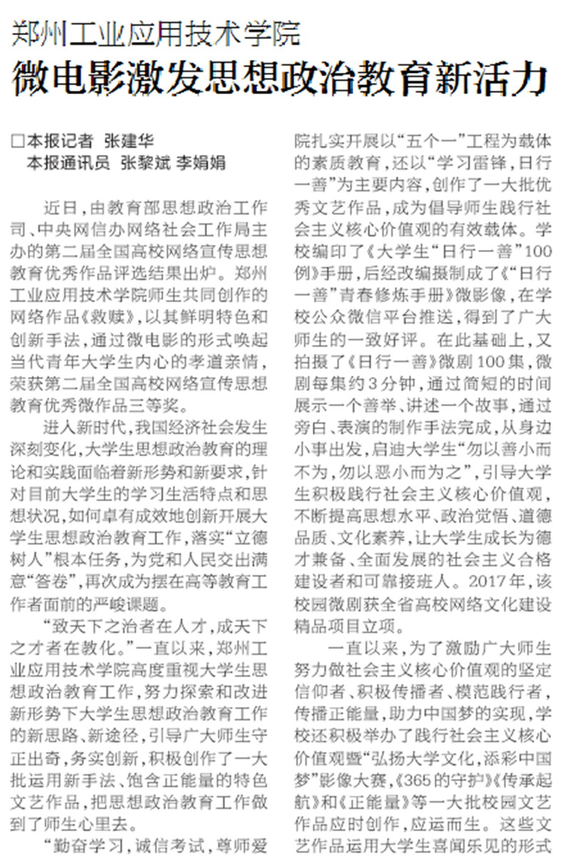 近年来,郑州工业应用技术学院扎实开展以“五个一”工程为载体的素质教育,还以“学习雷锋,日行一善”为主要内容,创作了一大批优秀文艺作品,成为倡导师生践行社会主义核心价值观的有效载体。学校编印了《大学生“日行一善”100例》手册,后经改编摄制成了《“日行一善”青春修炼手册》微影像,在学校公众微信平台推送,得到了广大师生的一致好评。在此基础上,又拍摄了《日行一善》微剧100集,微剧每集约3分钟,通过简短的时间展示一个善举,讲述一个故事,通过旁白、表演的制作手法完成,从身边小事出发,启迪大学生“勿以善小而不为,勿以恶小而为之”,引导大学生积极践行社会主义核心价值观,不断提高思想水平、政治觉悟、道德品质、文化素养,让大学生成长为德才兼备、全面发展的社会主义合格建设者和可靠接班人。2017年,该校园微剧获全省高校网络文化建设精品项目立项。