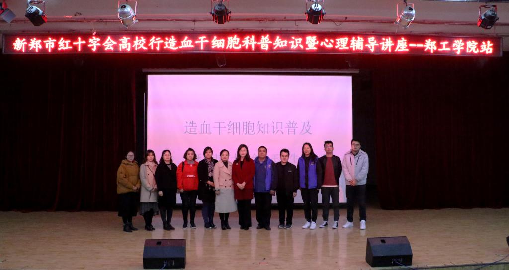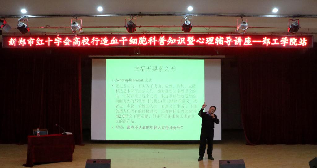 本次活动邀请到了新郑市红十字会王立生为同学们进行造血干细胞知识的科普讲解;新郑市成功捐献造血干细胞志愿者90后代表左鹏旭通过自身的先进事迹讲述了造血干细胞捐献感人至深的故事;最后,新郑市成功捐献造血干细胞志愿者代表、国家二级心理咨询师韩述钦为同学们做心理辅导讲座。
