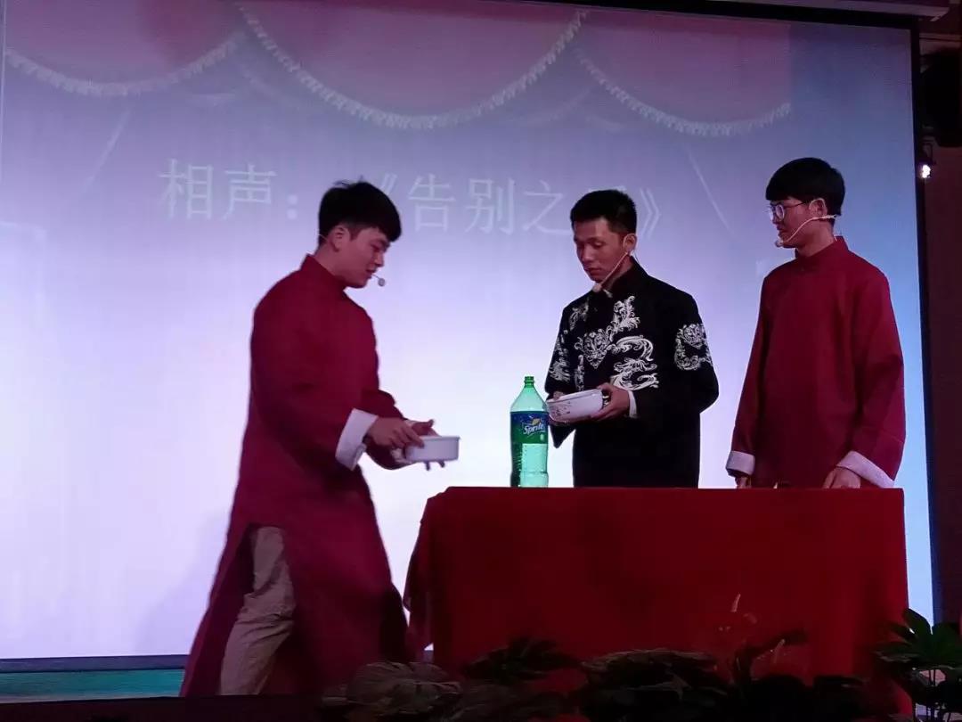曲艺协会第一届团支书张世林带着两个接班人王哲、高钰杰在最后为大家倾情奉献的《告别之后》,通过一系列幽默风趣的践行形式,表达了学弟对学长即将实习的依依不舍和对学长即将踏入社会的美好祝愿,引发了观众的共鸣。