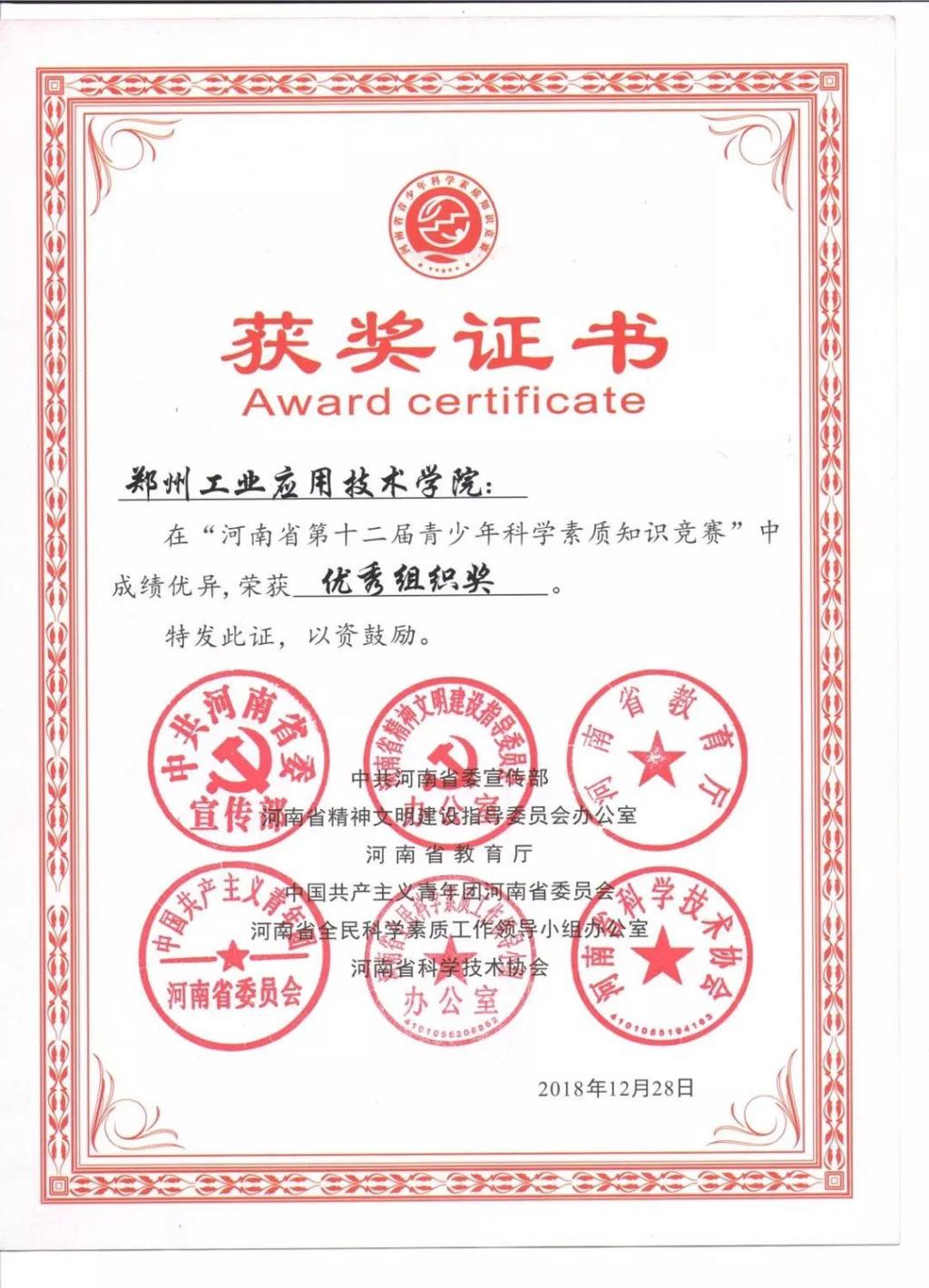 本次赛事,我校高度重视、积极组织宣传,全校12个学院共计20000余人参与其中,经评委会审评,我校荣获河南省第十二届青少年科学素质知识竞赛“优秀组织奖”,我校学生路惠文、吴林雨、张远铂、赵向阳、尚喆荣获大学组一等奖;丁娅、兰翔、王琪、郑蒙蒙、陈帅、代铭荣获大学组二等奖;詹恒斌、梁雨、王泽、慧智千、范凯丽、潘鑫、康玮、张家璇荣获大学组三等奖,我校教师杨衍磊、牛璐、郭青、徐明慧荣获优秀辅导奖。近年来郑州工业应用技术学院高度重视学生科技创新实践的培养,在各项科技竞赛中获得了喜人的成绩,展现了学校教育教学水平和学生科技创新能力。以后,学校将继续推进教学改革,不断培养青年学生的科学探究和创新实践能力。