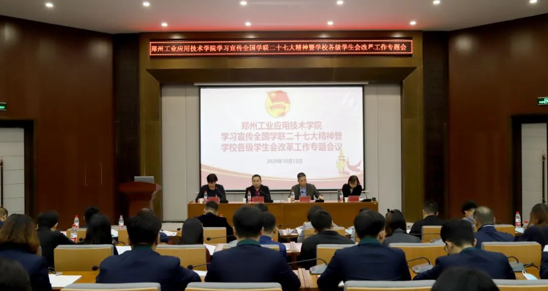 为全面贯彻落实全国学联二十七大会议精神,深入学习习近平总书记贺信精神,号召广大青年学生“坚定跟党走,奋进新时代”,郑州工业应用技术学院于2020年10月13日在全校范围内组织召开学习宣传全国学联二十七大精神暨全校各级学生组织深化改革专题会议。