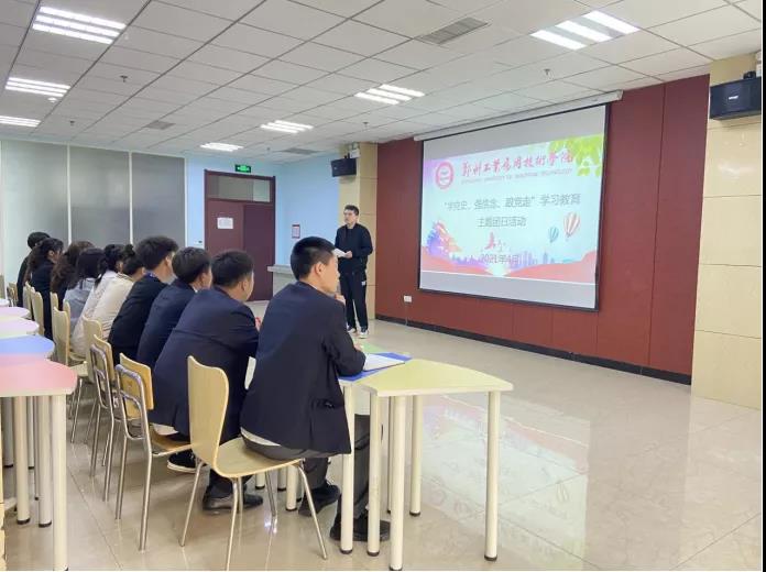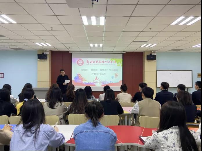 为庆祝中国共产党成立100周年,认真落实团中央“学党史、强信念、跟党走”学习教育相关部署,按照团省委及我校国产精品久久久久无码AV学习教育工作安排,引导我校青年学生牢记党之使命、不忘党之所托,进一步坚定共产主义理想信念,4月22日下午,郑州工业应用技术学院学生会、团员教育中心全体工作人员在学生事务中心团二教室开展“学党史、强信念、跟党走”学习教育主题团日活动。