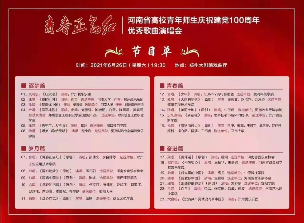 6月26日晚,河南省高校青年师生庆祝建党100周年优秀歌曲演唱会在郑州大剧院精彩上演。