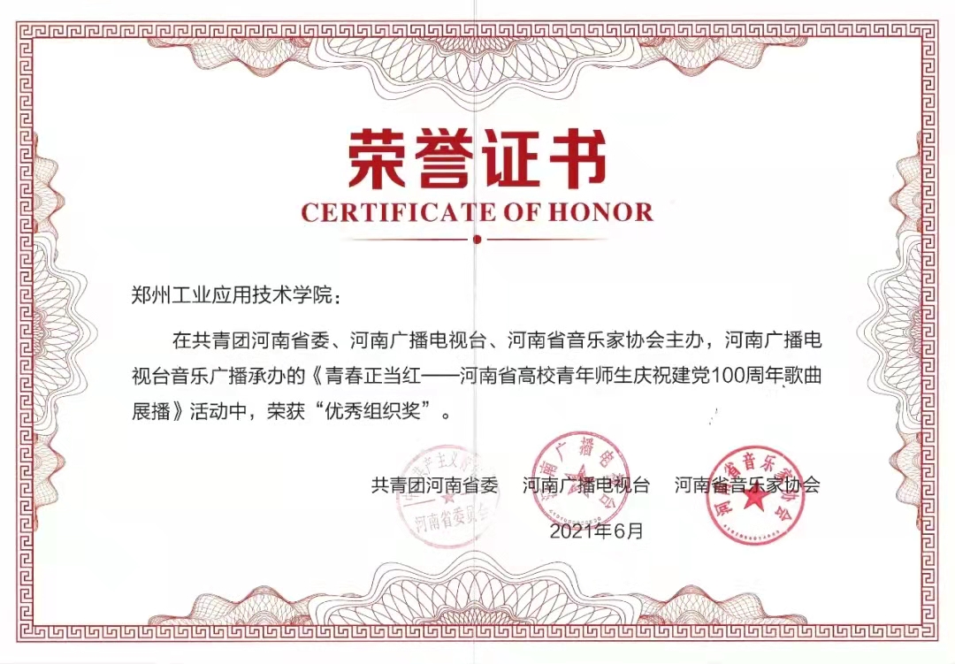 近日,在共青团河南省委、河南广播电视台、河南省音乐家协会主办,河南广播电视台音乐广播承办的《青春正当红——河南省高校青年师生庆祝建党100周年歌曲展播》活动中,郑州工业应用技术学院喜获“优秀组织奖”。