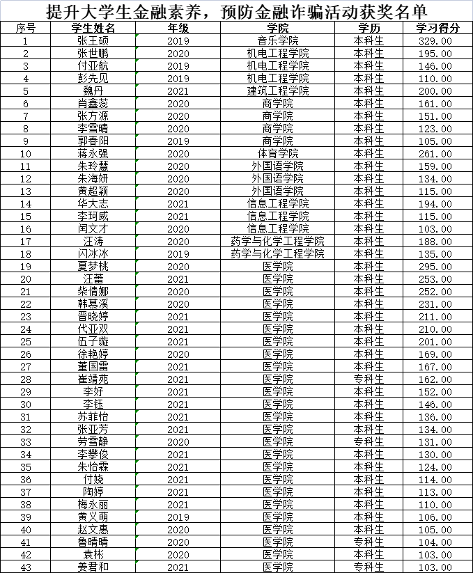 通过校学生会、各学院学生会的共同努力,本次活动圆满结束,活动评选出学习得分超过100分的43名同学为“优秀个人”。药学与化学工程学院学生会、医学院学生会、音乐学院学生会、商学院学生会荣获“优秀组织奖”。通过本次活动,同学们在有趣的实践活动中学习金融知识,提升个人金融素养,增强自我投资保护意识。