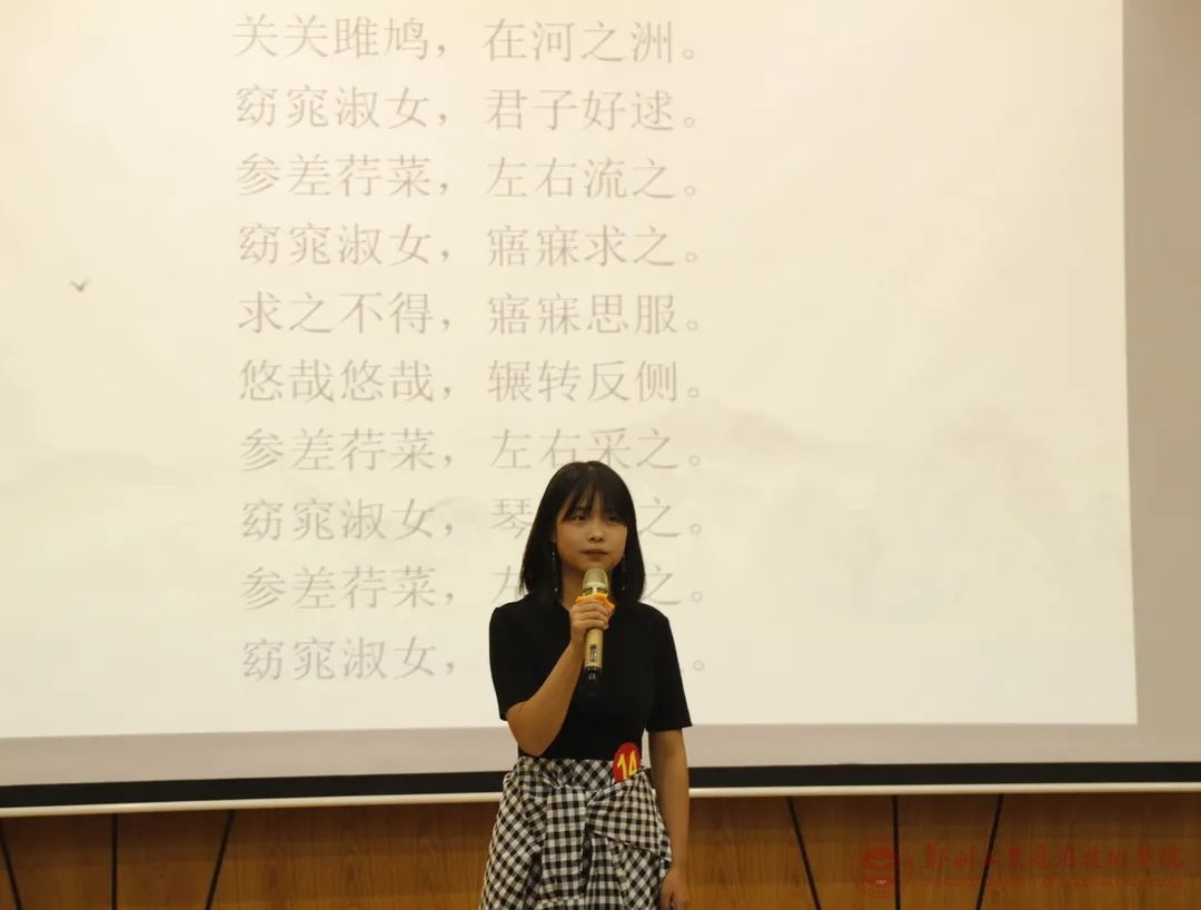 比赛现场气氛热烈,同学们热情高涨。参赛选手们以其铿锵有力的气势,充沛饱满的感情,自信大方的形象赢得老师和同学们的阵阵掌声。选手们的诗歌主题也是包罗万象,有以《关雎》为代表的朦胧感情,有以《将进酒》为代表的悲壮豪情,现场观众就这样随着选手们领悟着这千百种感情。