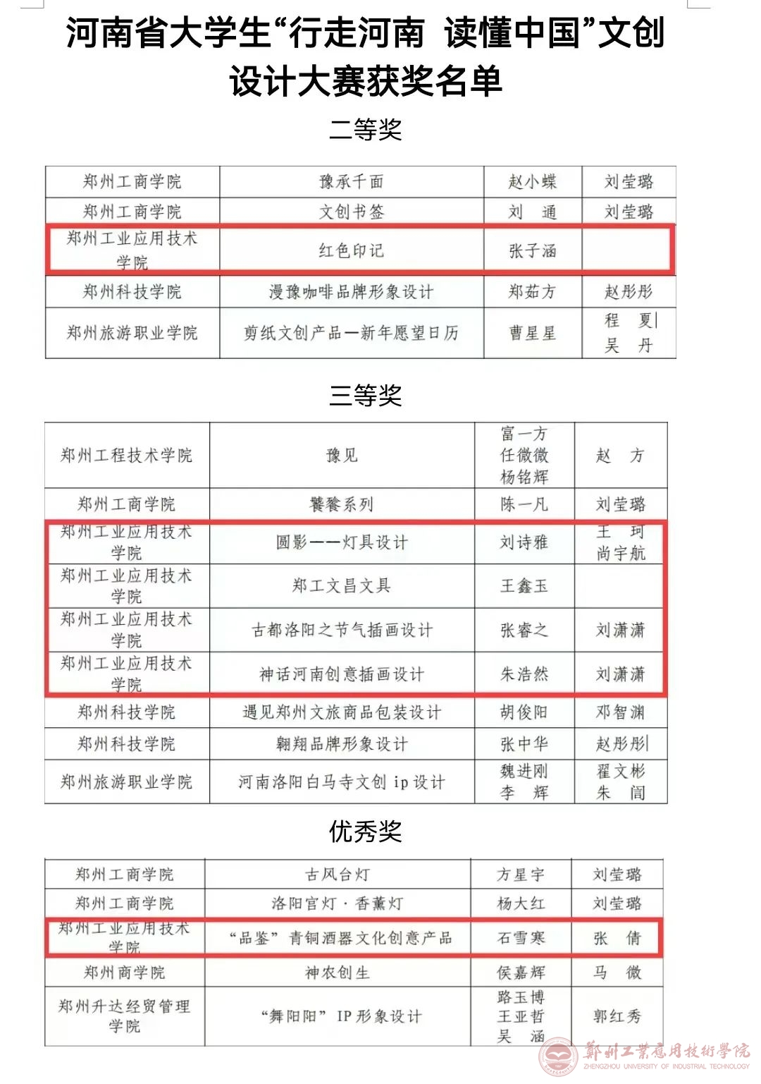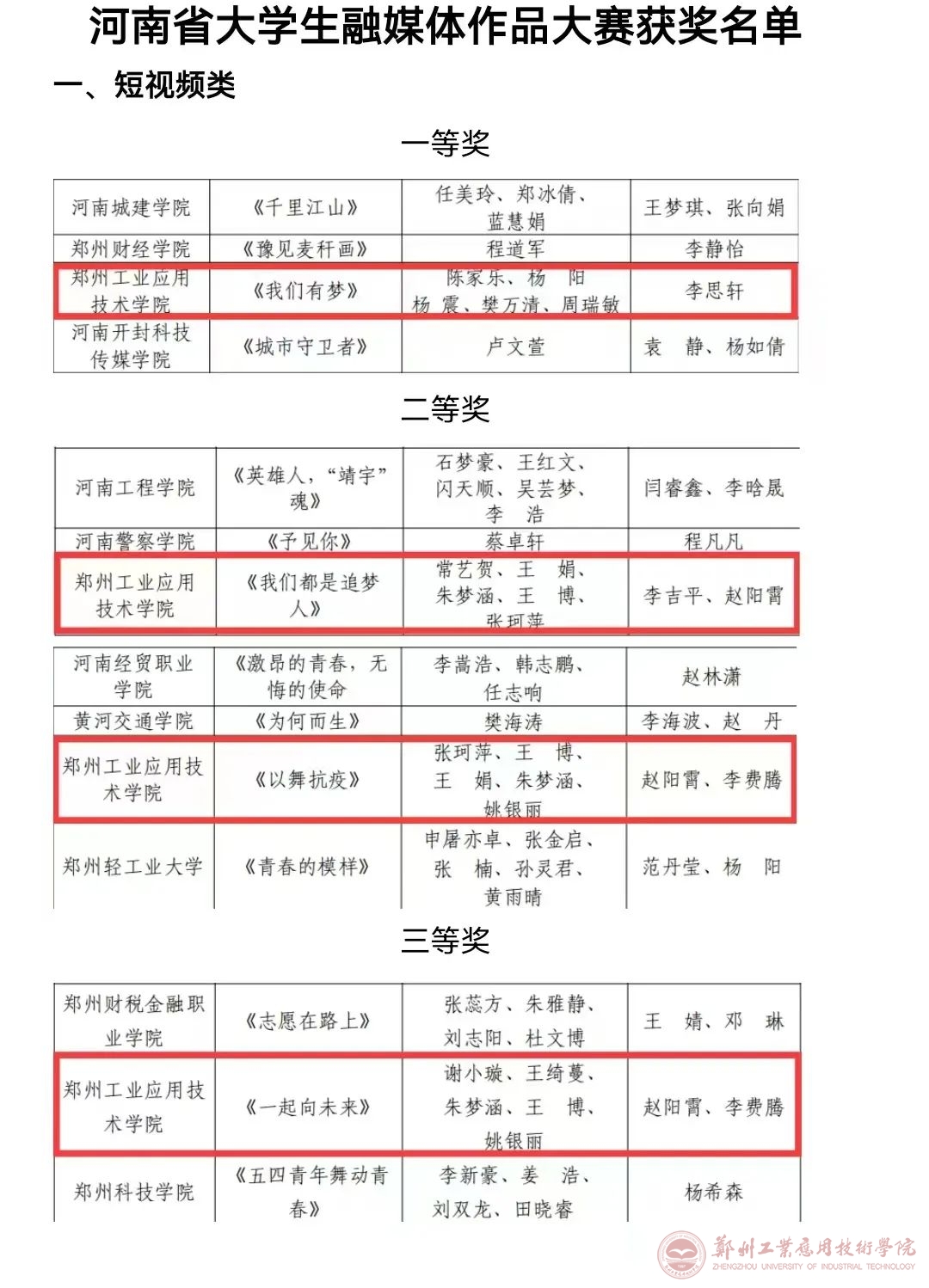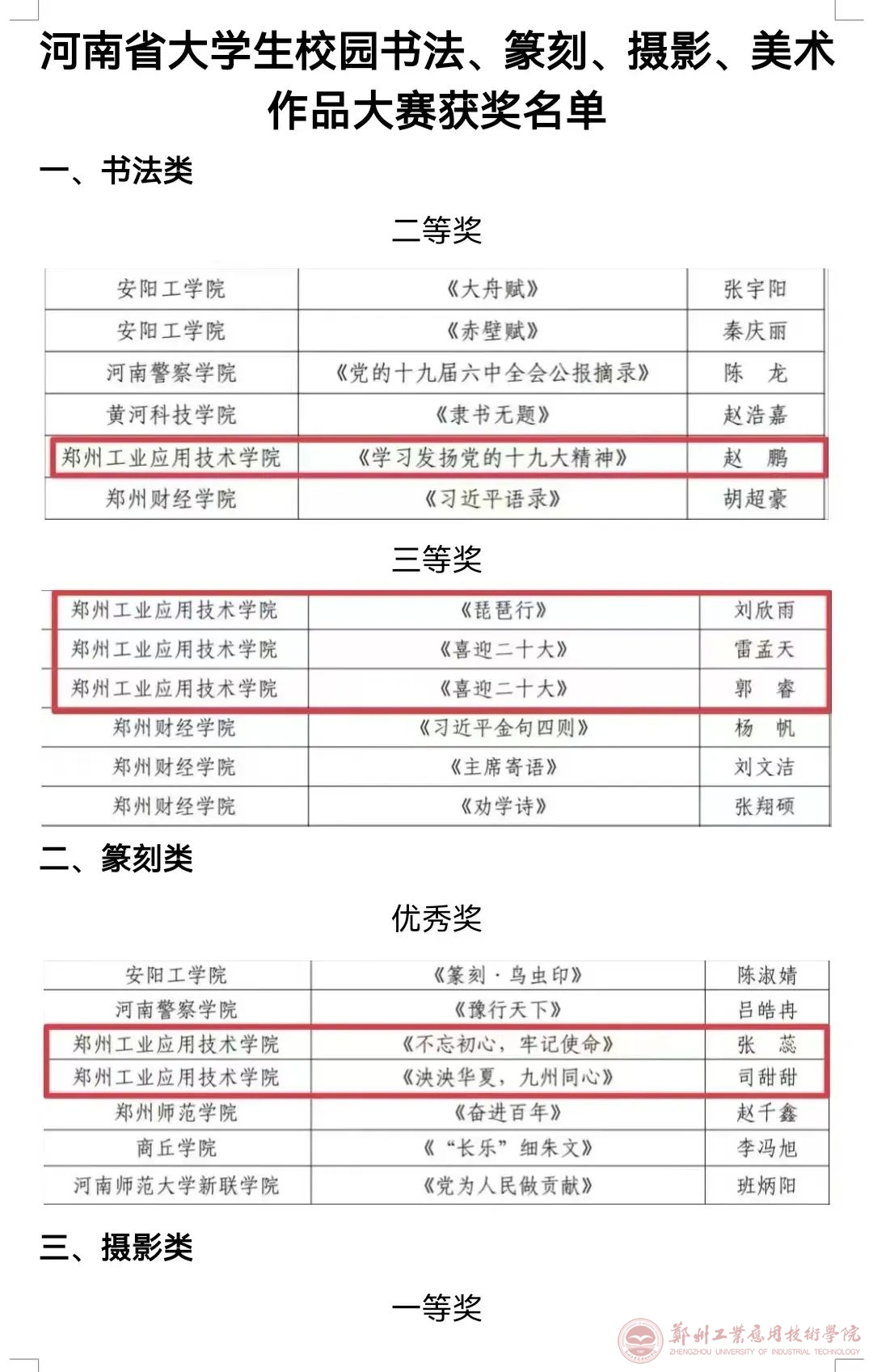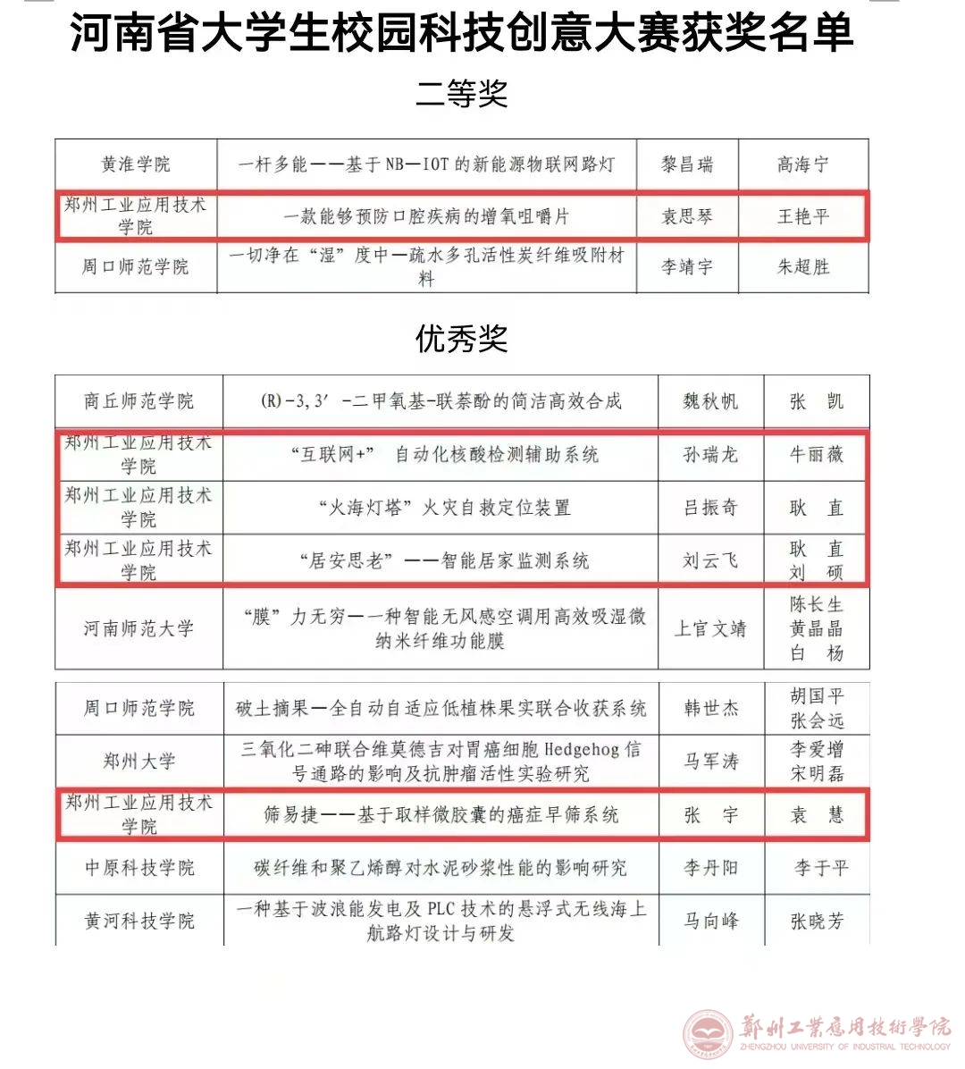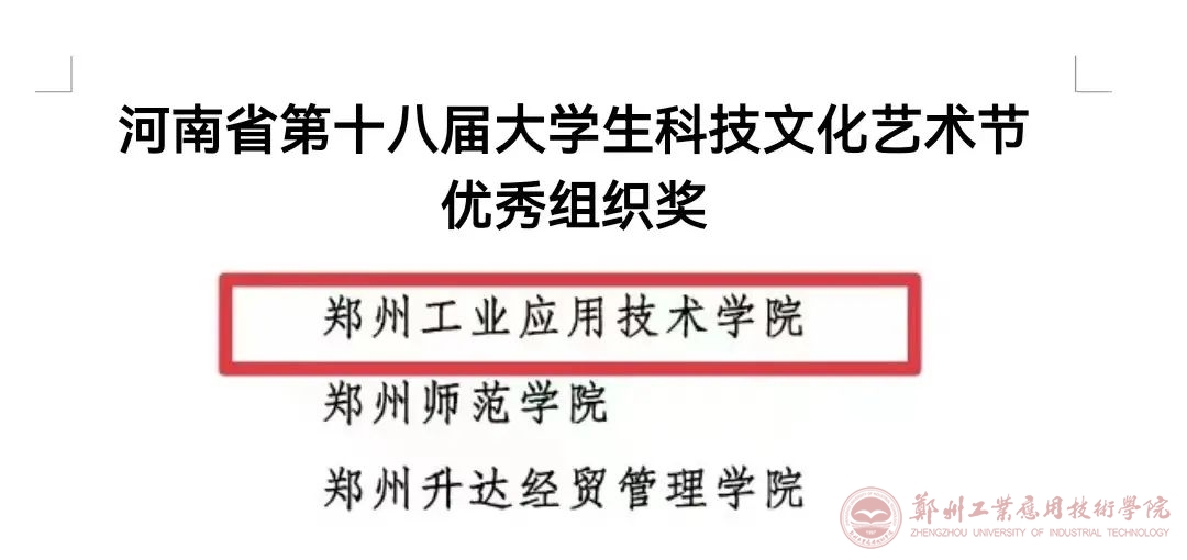 近日,由中共河南省委宣传部、河南省教育厅、共青团河南省委、河南省科学技术厅、河南省学生联合会共同举办的河南省第十八届大学生科技文化艺术节各奖项揭晓,其中我校成绩优异,荣获“优秀组织奖”,在参与的十三项比赛中共获得53项荣誉。其中荣获一等奖6项、二等奖19项、三等奖17项、优秀奖11项。