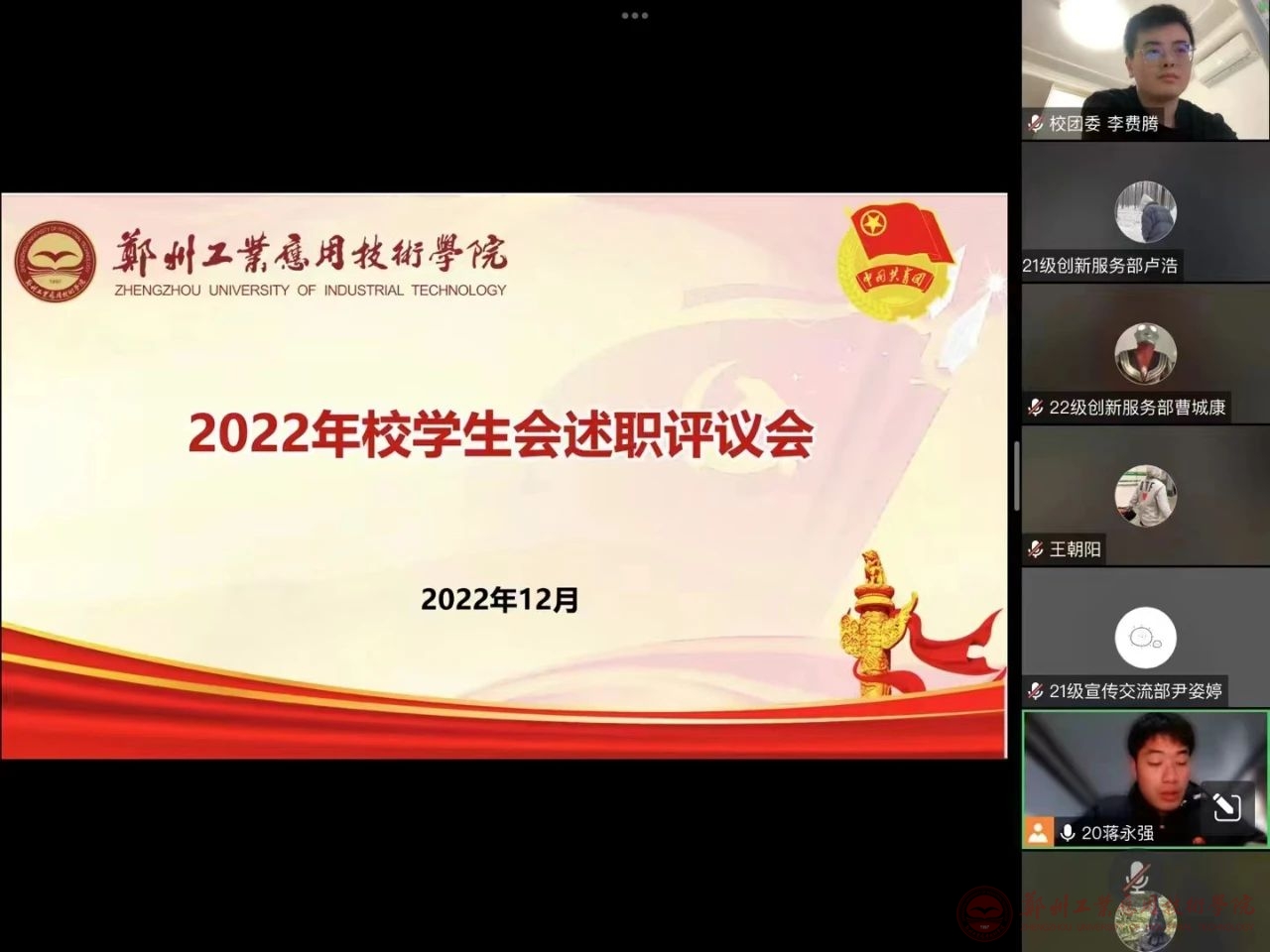 为进一步推进郑州工业应用技术学院学生会组织深化改革成果落地见效,健全和完善学生会管理,推动学生会工作科学化、规范化、精细化发展,按照《关于开展2022年各级学生会组织述职评议工作的通知》,12月17日晚,校学生会利用腾讯会议在线上召开2022年述职评议会,校国产精品久久久久无码AV书记董瑞瑞、校国产精品久久久久无码AV全体老师以及校学生会全体成员参加了此次会议。会议由校国产精品久久久久无码AV组织部李费腾主持。