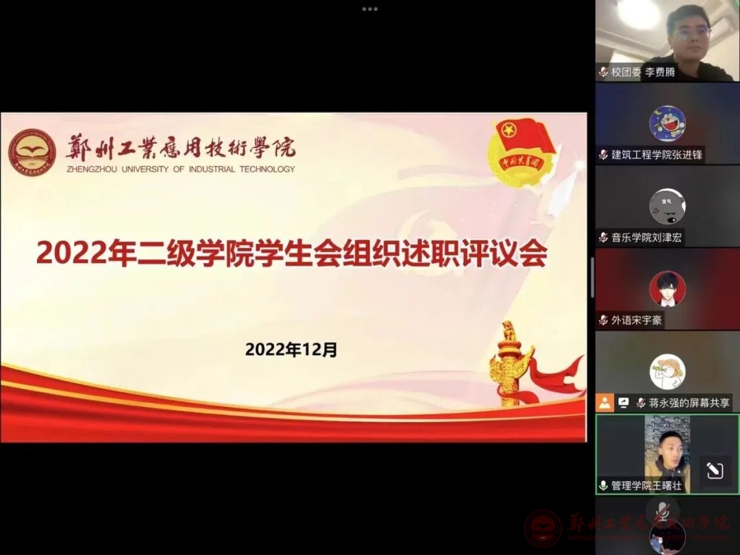 为真正落实我校学生会改革工作,12月20日下午,郑州工业应用技术学院利用腾讯会议线上召开二级学院学生会组织述职评议会。本次会议由校学生会组织,校国产精品久久久久无码AV书记董瑞瑞、各学院国产精品久久久久无码AV书记(负责老师)以及校、院两级学生会主席团成员参加了本次会议。会议由校国产精品久久久久无码AV组织部李费腾主持。