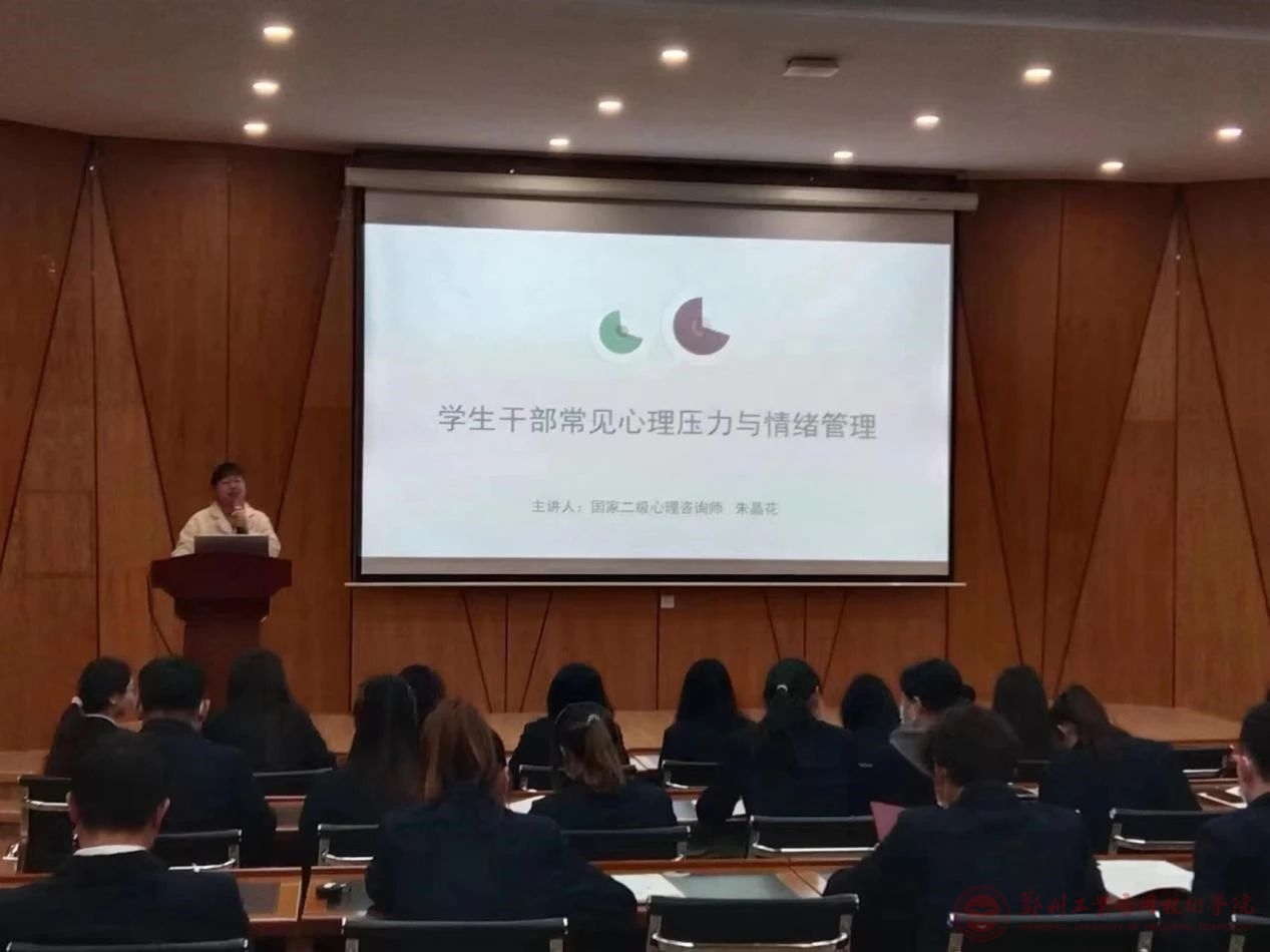为时刻关注学生干部心理状态,传播心理健康知识,引导学生正视心理问题,养成健康的生活方式。3月28日晚,第十四期“青马工程”培训班邀请心理健康教育中心朱晶花老师在建工楼梦想厅为70名“青马”学员作了题为《学生干部常见心理压力与情绪》的课程。