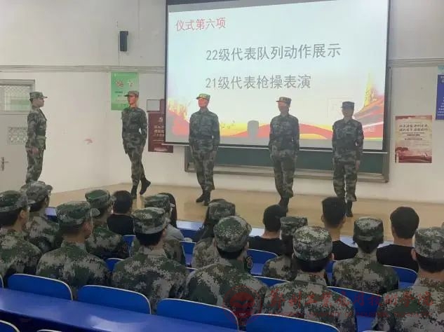 21级作训部队员付中带领4名22级代表进行队列动作展示,他们个个精神抖擞,步伐整齐,动作整齐划一。他们在训练中磨练意志,锤炼品格,培养了良好的精神风貌。紧跟着是21级五名女队员枪操表演展示。她们英姿飒爽,动作整齐划一,展现了国旗护卫队的优良品质。