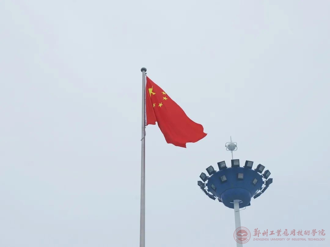国旗广场上,国旗护卫队迈着铿锵有力的步伐,伴随着雄壮的《义勇军进行曲》,五星红旗冉冉升起,迎风飘扬,全体师生整装肃立,向国旗行注目礼、齐唱国歌,升旗仪式肃穆隆重。