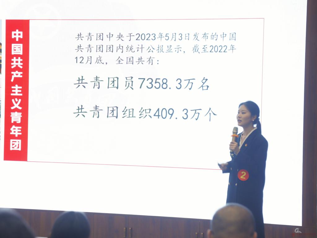 本次比赛分为两个环节,第一个环节为“青年说”微团课分享,选手利用新媒体手段,通过PPT演示围绕党史国情、团情团史、基础团务等内容进行讲授,内容充实,语言生动,形式多样,贴近青年,达到团员青年真正欢迎、真正受教育的效果。第二个环节为团务知识现场问答,选手根据抽到的题目依次进行回答。