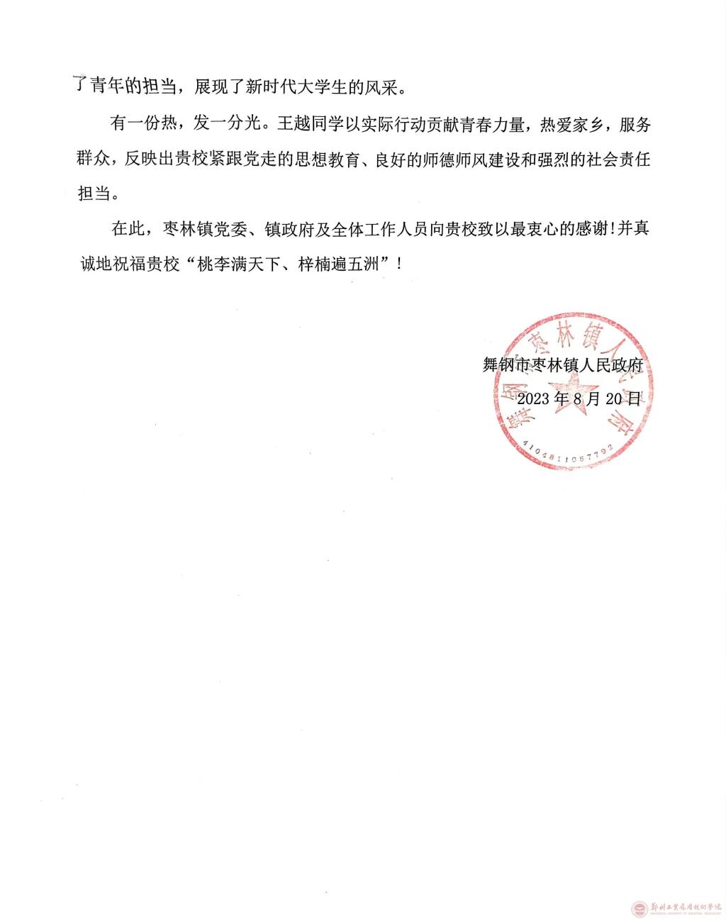近日,郑州工业应用技术学院分别收到了来自舞钢市枣林镇人民政府的两封感谢信,表扬我校机电工程学院韦春琦同学、药学与化学工程学院王越同学在武冈市枣林镇“返家乡”社会实践中的突出表现,以及共青团郑州委员会的一封感谢信,表扬我校建筑学专业王苗苗,药学专业李壮瑜等9位同学在2023年郑州市“引力计划”大学生政务实践活动中的突出表现。