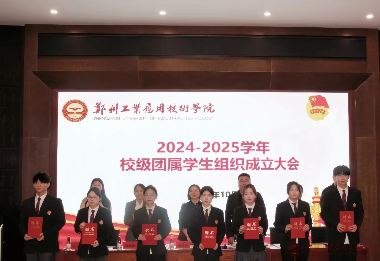 会上,副校长刘山玉宣读《郑州工业应用技术学院关于2024-2025学年团属学生组织学生干部聘任的决定》,与会领导为团属学生组织代表颁发聘书。